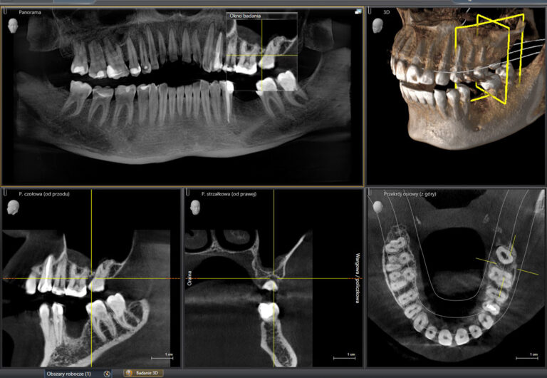 W wielu sytuacjach np. przed leczeniem endodontycznym czy zabiegami chirurgicznymi niezbędne jest wykonanie bardziej szczegółowych badań, do których należy CBCT – cyfrowa tomografia stożkowa kości. Otrzymujemy wtedy obraz 3D badanych struktur.